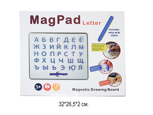 Обучающий планшет поможет ребёнку интересно и весело провести время за изучением букв. В комплекте: планшет в виде пластиковой доски с множеством ячеек, стилус с магнитным наконечником и металлические шарики. С помощью них ребёнок будет рисовать буквы.